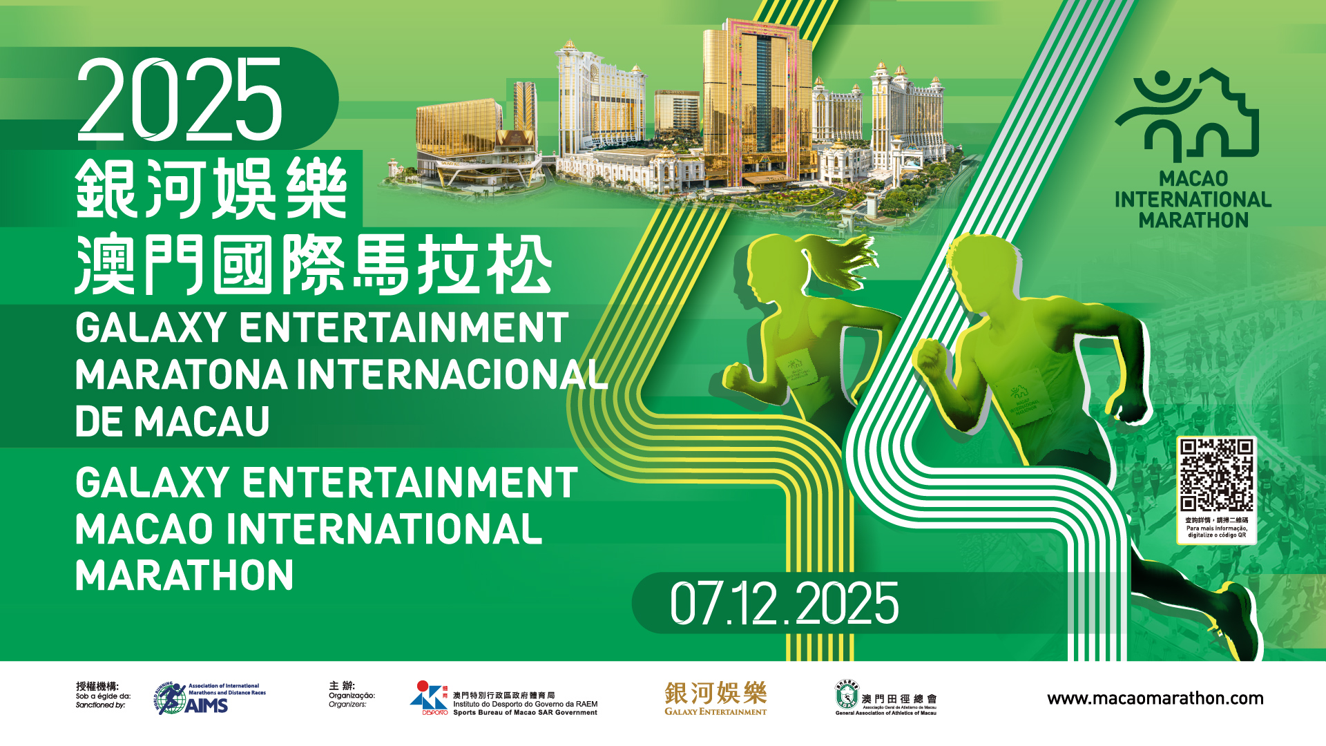 All participants are reminded to read the regulations carefully and to familiarize themselves with the race route, and are also advised to prepare and train for the event according to their own physical conditions. For more information, please visit the official website www.macaomarathon.com, refer to the “Macao International Marathon” official mobile app, or follow the “Macao Major Sporting Events” Facebook page, the “澳門體育” (Macao Sports) WeChat public account and the “澳門特區體育局” (Macao SAR Sports Bureau) WeChat subscription account.