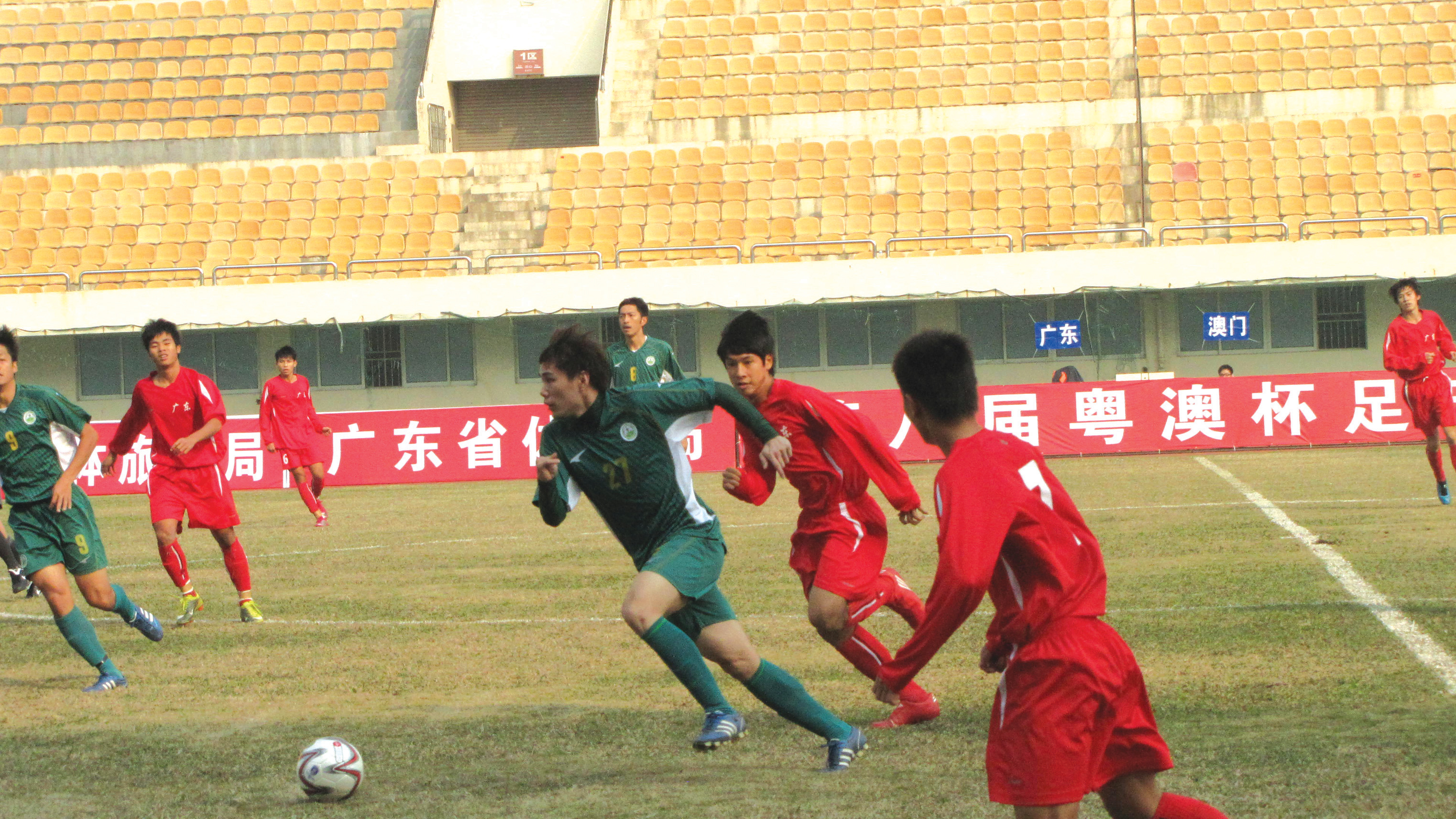 O jogo da 1ª eliminatória do “8º Torneio de Futebol da Taça Guangdong-Macau” realizou-se no dia 21 de Dezembro no Centro Desportivo da Cidade de Zhuhai. A cerimónia do aperto de mão foi presidida pelo vice-presidente do Instituto do Desporto de Macau, Dr. Pun Weng Kun, pelo vice-presidente do Instituto do Desporto da Província de Guangdong, Sr. Zhao Shao Ming, pelo vice-presidente da Associação Geral do Desporto da Província de Guangdong, Sr. Cai Wei Xiong, e pelo presidente do Conselho de Supervisão da Associação de Futebol de Macau, Sr. Chang Chin Nam. Depois desta cerimónia, iniciou-se de imediato o jogo da 1ª eliminatória do “8º Torneio de Futebol da Taça Guangdong-Macau”. Logo no início do jogo, a equipa de Macau atacou activamente a equipa adversária, ao fim de 9 minutos, o jogador de Macau, Ho Wai Tong, marcou o primeiro golo de cabeça. Entretanto, e antes de os jogadores adversários da equipa de Guangdong recuperarem a posição, um minuto depois, o jogador de Macau, Leong Chung In, marcou rapidamente o segundo golo depois dos seus colegas lhe passarem a bola, passando para 2-0, resultado que se manteve até terminar a primeira parte do jogo. No início da segunda parte do jogo, a equipa de Macau continuava a atacar, e 50 minutos depois, o jogador de Macau, Wong Wa Lon, correu até à área da penalização para alcançar a bola dos colegas que tinha partido da área da linha inferior, marcando outro golo. A equipa de Macau venceu por 3-0. Mais tarde, a equipa de Guangdong reorganizou rapidamente o contra-ataque e tentou muitas vezes aproximar-se da baliza, mas não conseguiu sucesso. Pelo contrário, 60 e 80 minutos depois os jogadores Che Chi Man e Leong Ka Hang, respectivamente, marcaram mais uma vez golos na baliza do adversário. No final, a equipa de Macau venceu a equipa de Guangdong na 1ª eliminatória por 5-0.