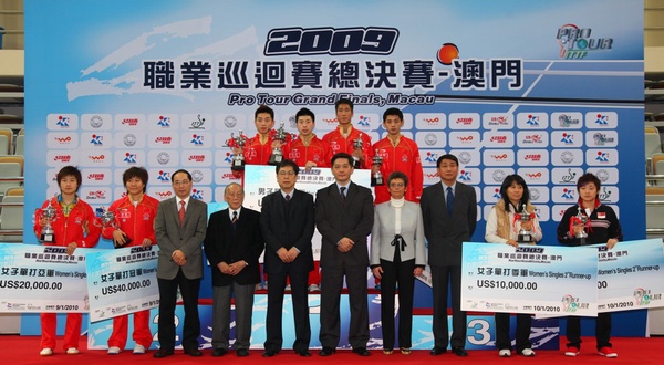 由國際乒乓球聯合會授權,體育發展局及澳門乒乓總會聯合主辦的「2009職業巡迴賽總決賽-澳門」昨晚於塔石體育館圓滿結束,男、女子單打錦標國家隊馬龍與郭焱衛冕成功,兩人分別在決賽以4-2擊敗隊友許昕及4-3勝丁寧,各贏得4萬美元獎金,亞軍許昕及丁寧各奪得2萬美元獎金,並列賽事季軍的王勵勤、張繼科、韓國金景娥及新加坡馮天薇各奪1萬美元獎金。