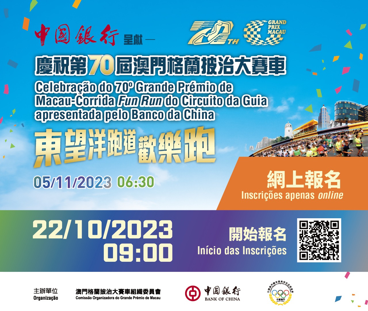 「中國銀行呈獻—慶祝第70屆澳門格蘭披治大賽車—東望洋跑道歡樂跑」將於11月5日上午6時30分起跑,全程約6.2公里,起點及終點均設於澳門格蘭披治賽車大樓。活動將於10月22日(週日)上午9時開始接受報名,報名名額共4,000個,對象為15歲或以上人士(2008年或之前出生 ),報名費為澳門元50元。