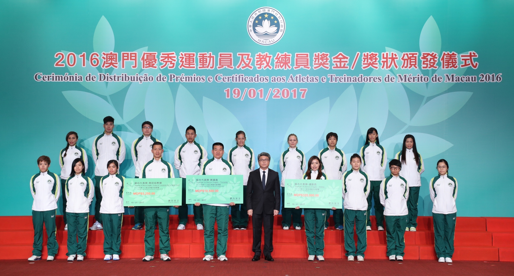 為表彰在2016年度參加體育比賽中獲得優秀成績的運動員及教練員,『2016澳門優秀運動員及教練員獎金/獎狀頒發儀式』今日(19日)晚上七時半於漁人碼頭會議展覽中心舉行,社會文化司司長譚俊榮等出席了頒發儀式,並祝賀獲獎的運動員和教練員。