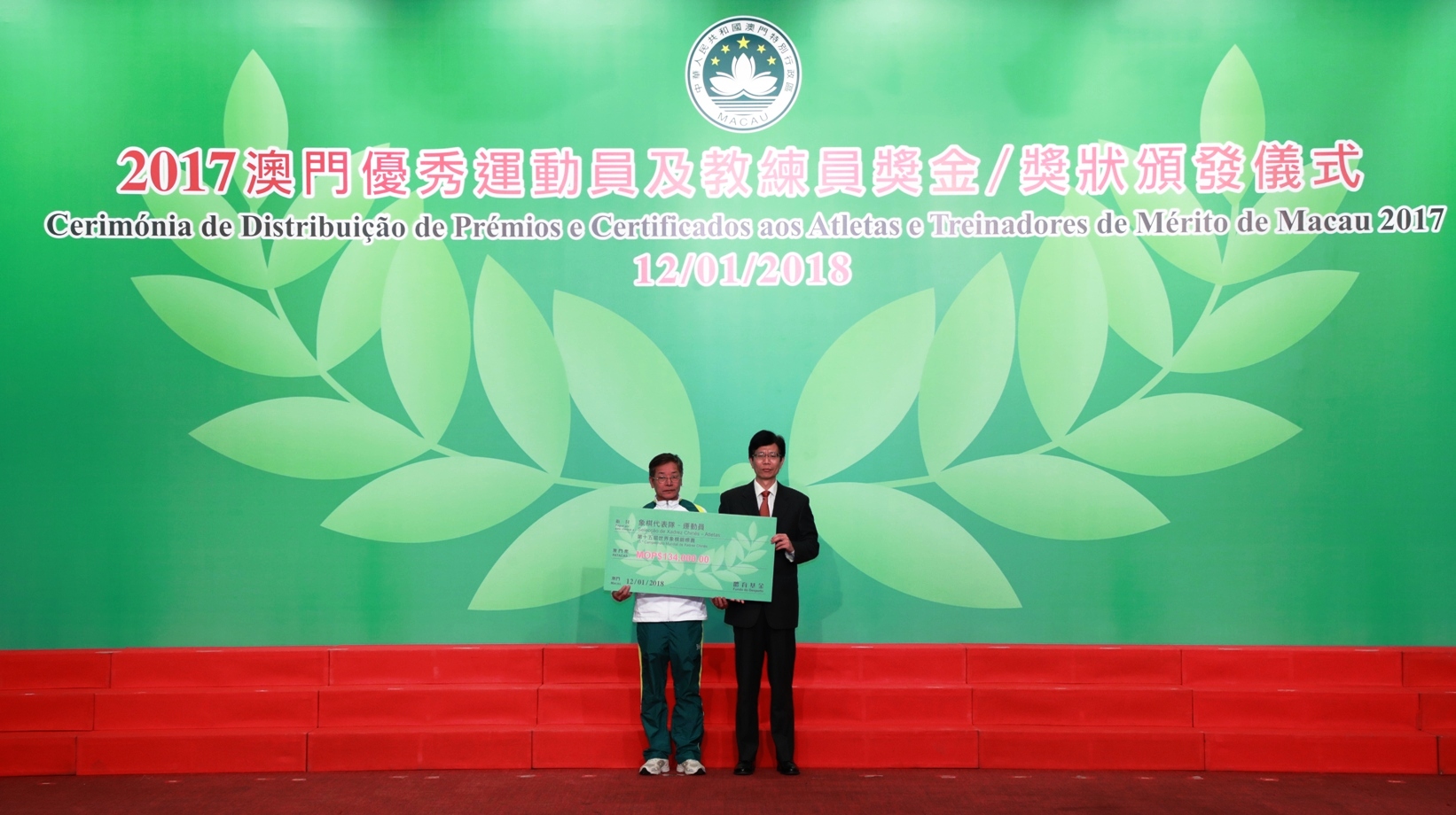 為表彰在2017年度參加體育比賽中獲得優秀成績的運動員及教練員,『2017澳門優秀運動員及教練員獎金/獎狀頒發儀式』今日(12日)晚上七時半於漁人碼頭會議展覽中心舉行,社會文化司司長譚俊榮等出席了頒發儀式,並祝賀獲獎的運動員和教練員。