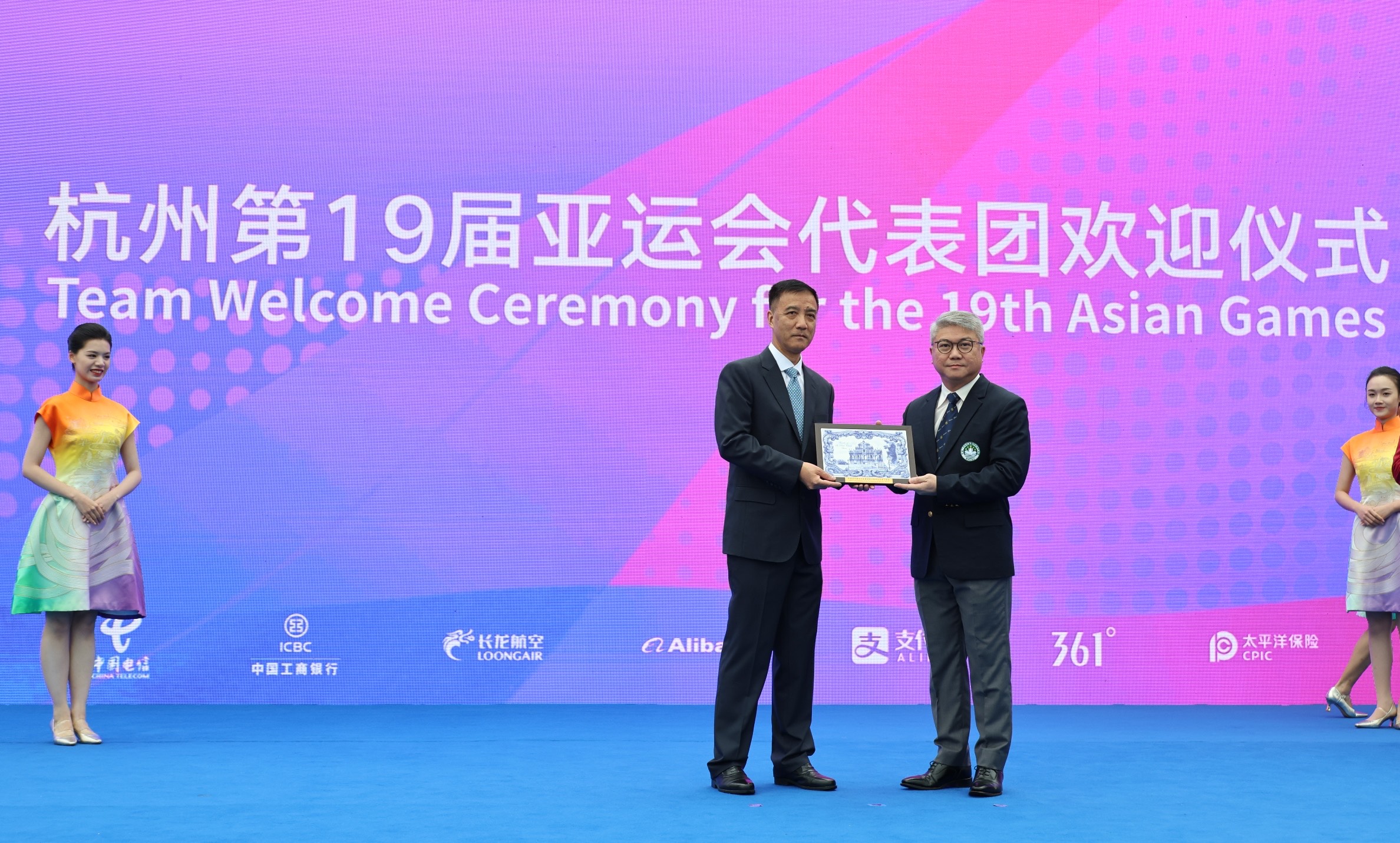 中國澳門體育代表團歡迎儀式今日上午在亞運村運動員村內旗幟廣場舉行,儀式先由杭州市人大常委會副主任、杭州亞運村運行管理中心執行指揮長盧春強致歡迎詞,向各代表團入村致以熱烈的歡迎;接着進行各出席國家及地區的奏國歌和升旗儀式,澳門特區區旗伴隨中華人民共和國國歌徐徐升起,標誌着中國澳門體育代表團正式進駐運動員村,隨後指揮長盧春強與中國澳門體育代表團團長潘永權互贈紀念品。