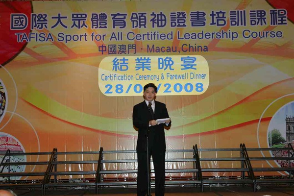 晚宴開始前,主辦單位先就澳門在大眾體育方面的發展作介紹,接著,分別由體育發展局代局長黃有力及國際大眾體育聯會財政兼亞洲大眾聯會秘書長狄拜恩致詞,黃有力感謝各學員的參與,勉勵各人將學到的知識在當地傳承,使大眾體育事業可以推展得更好,並讓各地的巿民生活質素都可以獲得進一步的提升,而狄拜恩則代表國際大眾體育聯會感謝澳門在主辦這次課程所付出的努力,並肯定整個課程的成果令人鼓舞,同時表示未來必將加強與澳門在大眾體育事業上各方面的合作。之後由黃有力及狄拜恩向各合格學員頒發證書,儀式後馬上開始歡送晚宴,學員們雖然在澳門只逗留了短短數天,然而各人之間已建立了深厚的友誼,離別在即,各人均表現出不捨之情,在宴會上各學員即席合唱一曲,並承諾今後將繼續保持聯絡,並將加強彼此的聯繫與合作。而各海外學員亦將於今天分批離澳。
