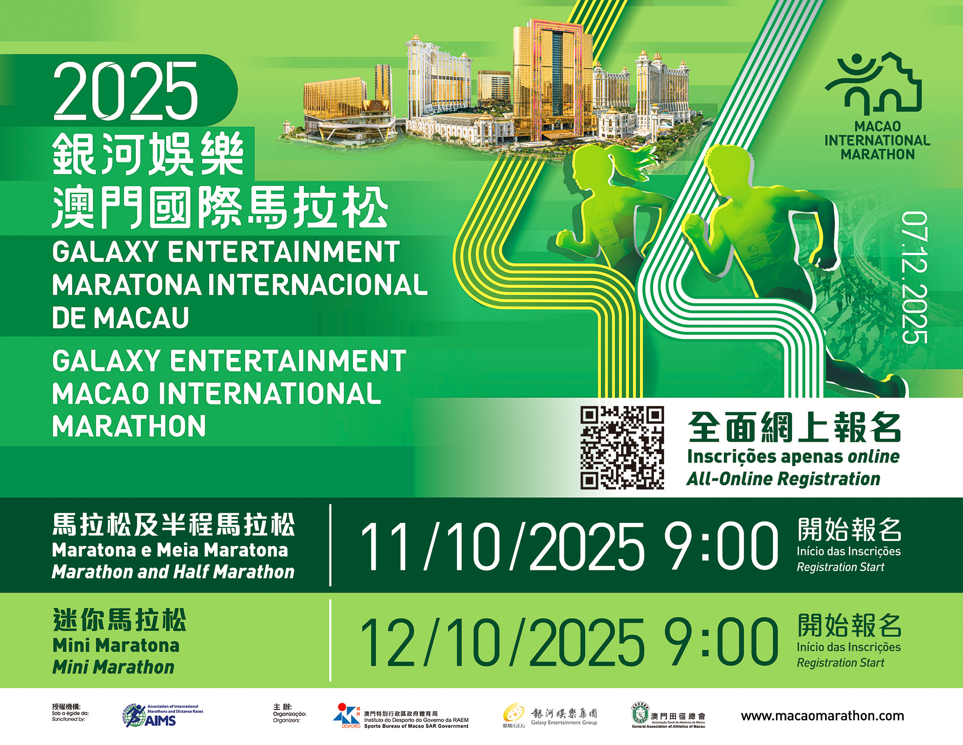 由體育局、銀河娛樂集團及澳門田徑總會主辦的「2025銀河娛樂澳門國際馬拉松」將於本年12月7日(周日)舉行。馬拉松及半程馬拉松項目將於10月11日(周六)上午9時開始接受報名,而迷你馬拉松的報名將於10月12日(周日)上午9時開始。各項目報名名額為:馬拉松1,800名,半程馬拉松4,800名,迷你馬拉松5,400名。名額有限,報滿即止。