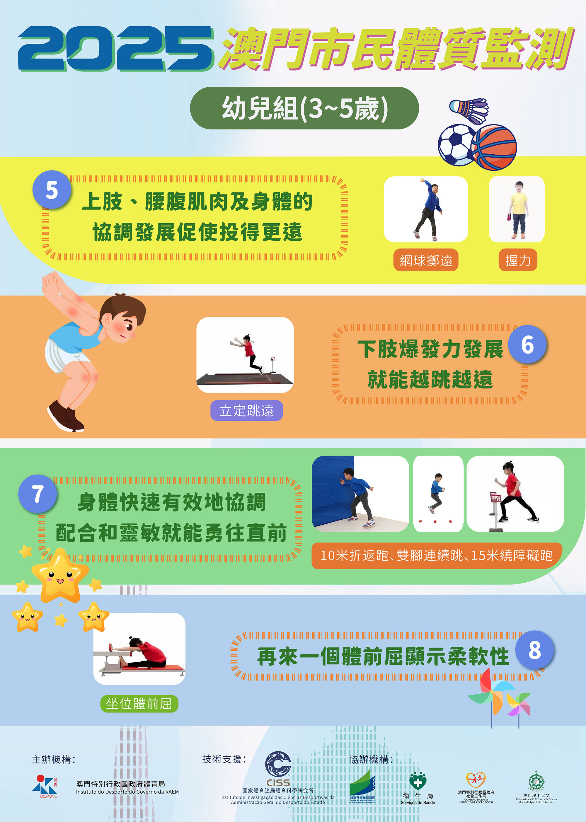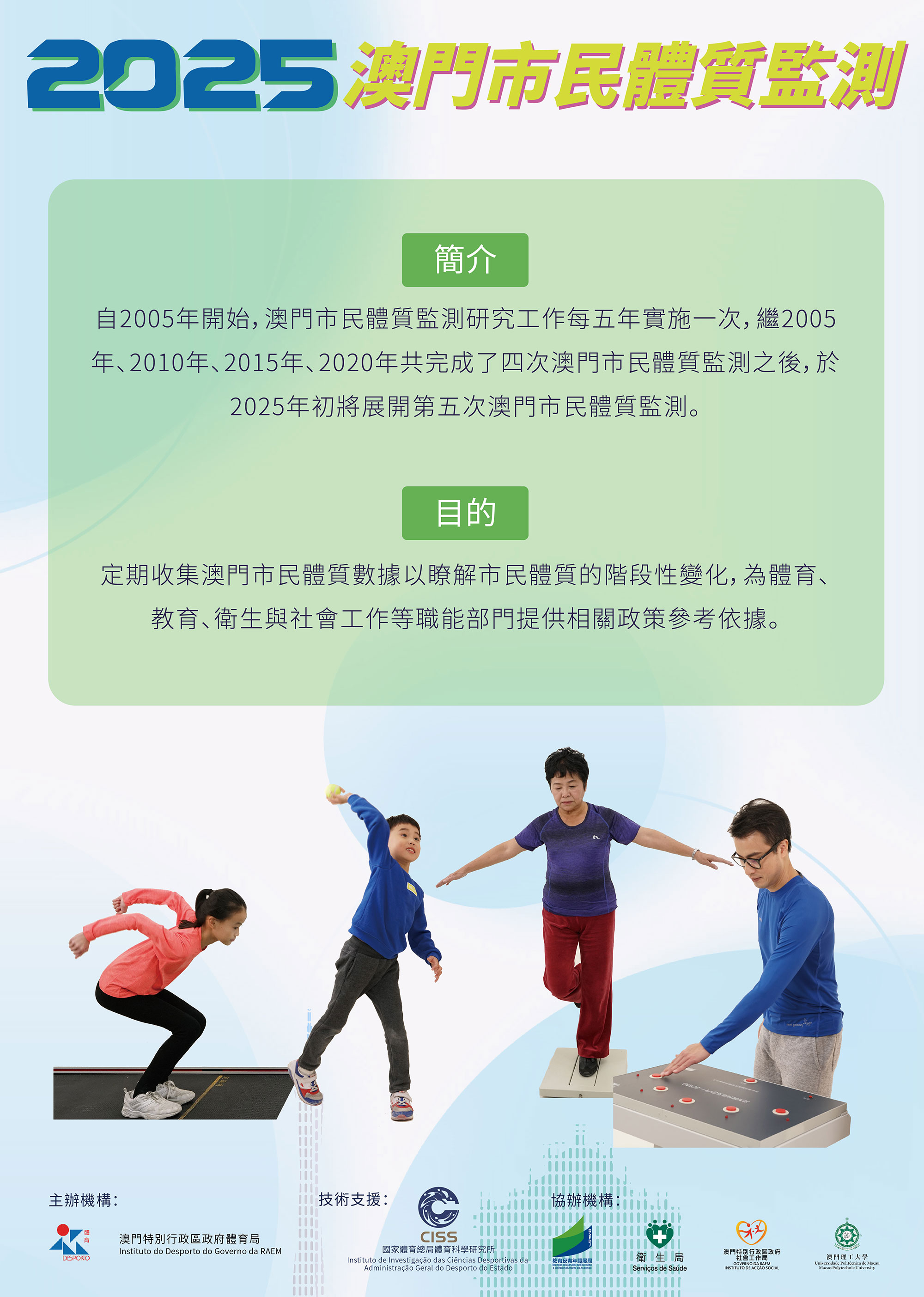 延續上述四次監測工作,2025年第五次澳門市民體質監測將繼續由體育局統籌,教育及青年發展局、衛生局、社會工作局和澳門理工大學協辦,並獲得國家體育總局體育科學研究所提供技術支援。